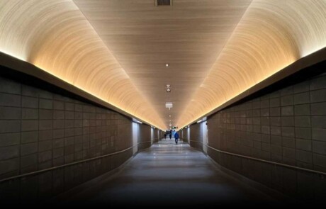 We manufactured custom metal ceiling cassettes with wooden finish, in curved, flat, and rounded shapes on the outside. The cassettes were perforated to optimize their acoustic properties.